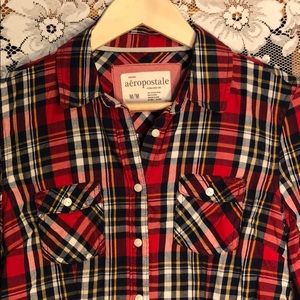 In good condition, no rips or tears. Cute red flannel shirt. Long sleeves have two buttons on the cuffs. Two front chest pockets. Made of 100% cotton. Smoke free home.