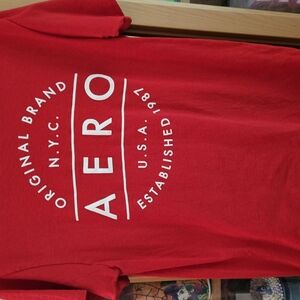 This Aeropostale red short sleeve tee is crafted from a comfortable cotton blend, featuring a bold 'AERO' branding in a unique geometric design. Perfect for casual outings, this solid red tee offers a stylish and relaxed fit.