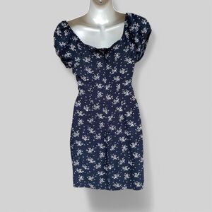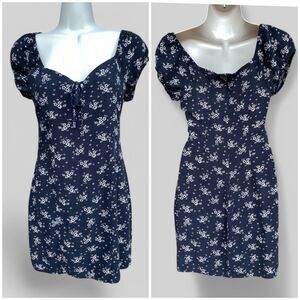 Aeropostale size S peasant dress in black with white florals, featuring a Y2K style with grunge and boho elements. It has a sweetheart neckline, back zip, and hook-and-eye closure.
