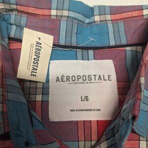 The Aeropostale Snap Shirt is a stylish, comfortable blend of plaid pink and blue. Perfect for men's large size, it features short sleeves and a collared design.