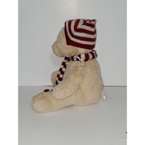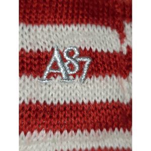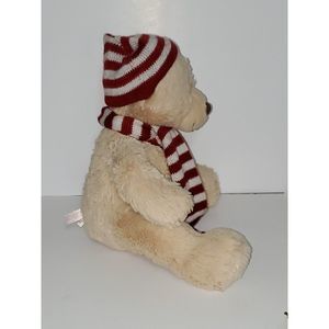 Aeropostale vintage teddy bear. He is soft and cuddly and in very good condition. His tags however are very worn. He wears a knit hat and scarf that has a little pocket on it and A87 in silver lettering on it. He may be from the opening of the store. His scarf looks like it could use a good cleaning, but it does not come off. 12" tall with floppy arms and legs. No holes or stains on the body.