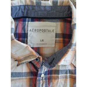 The multicolor plaid design features blue as the dominant color, with orange and red accents. The shirt has embroidered accents and a small Aéropostale logo on the front pocket. Perfect for any season, this shirt is preshrunk and breathable. Stay classic and casual with this Aéropostale button-up shirt.