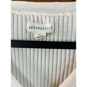 This Aeropostale white cardigan is the perfect addition to your wardrobe. With black stripes on the bottom and wrists, this knit sweater features a v-neckline and button accents. Made of a lightweight polyester and cotton blend, this cardigan is machine washable and perfect for travel, casual, or business occasions.
