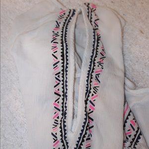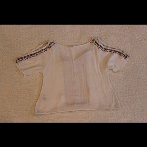 white crop top. long crop. pink and black detailing. open shoulder. sleeve. tassels
