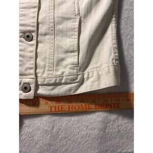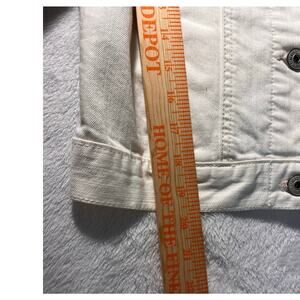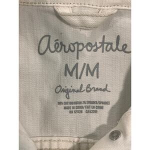 Trendy Aeropostale white denim jacket in women’s size M (medium) with rhinestone strawberry design on the back and sleeves. Button front, dual chest pockets, and Y2K-inspired sparkle swirl embellishments. In good pre-owned condition; please review all photos before purchasing. 98% cotton, 2% spandex.