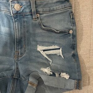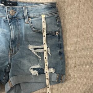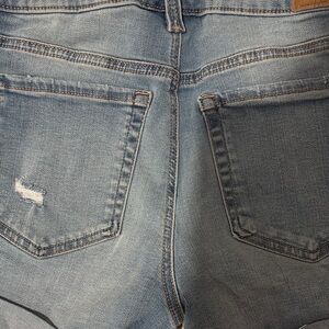 High rise shorts. Stretchy material. Non adjustable cuffed bottoms. Distressed material. Never worn. Great condition!