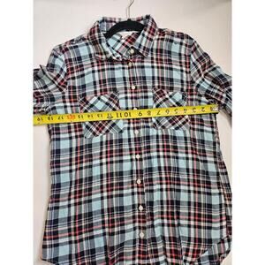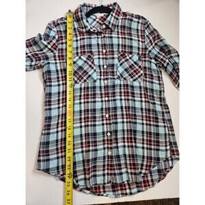 Aeropostale Womens Button Down Flannel L Blue Red Plaid Front Pocket Long Sleeve