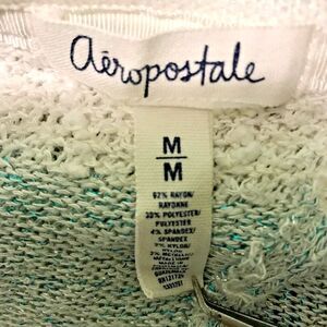 Aeropostale Aero, Women's size Medium, Short Cap Sleeve, Sheer Open Knit, Metallic Top. Blue and White Striped, back wrap style, Scoop Neck Sweater. So cute with shorts or jeans, shows just the right view of your back!