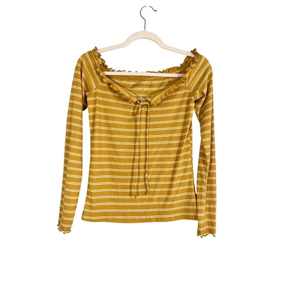 Aeropostale Y2K Rib Stripe Top L Yellow Ruffle Off Shoulder Preppy Chic Lace Up