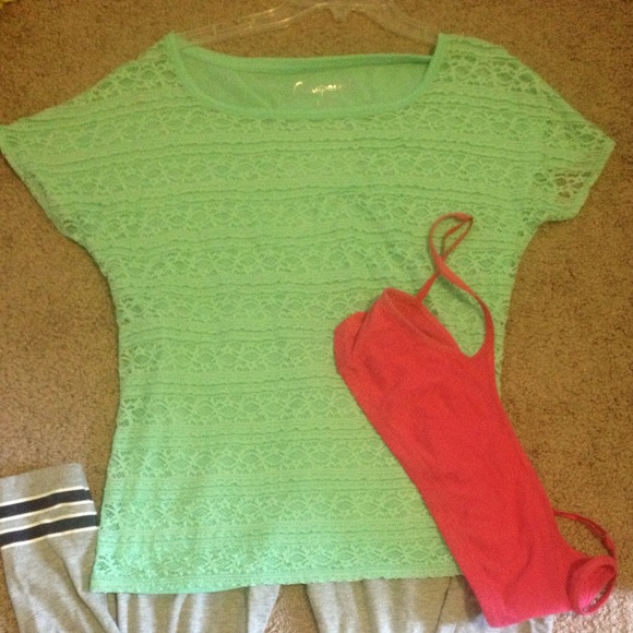 gray leggings with two blue stripes around the ankle. size Medium. lace seafoam green top large. pink sports bra large. obviously you don't have to wear this outfit together I just wanna get rid of them all!