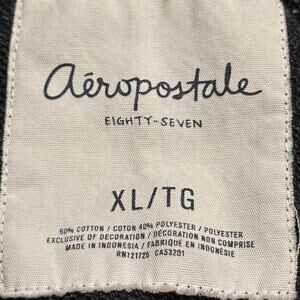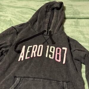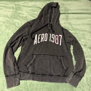 2013 Charcoal Aeropostale pullover hoodie with bold “AERO 1987” lettering across the chest in distressed white print outlined in pink embroidery. Black drawstrings, a kangaroo pocket, and subtle fading