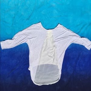 Light grey, 3/4 sleeve, high low t-shirt with a mesh back resembling a simple train. Mesh is a soft cream color and shirt is in good condition! Looks great with dark leggings or skinny jeans!!