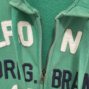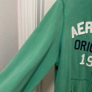 Aeropostale hoodie full zipper front men’s size XXL Green with logos, stained in 2 small spots on sleeves as shown in photos. Otherwise in great preowned condition.