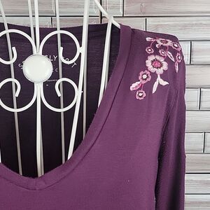 In their perfect "v" collection, this seriously soft rayon spandex blend top has pretty floral embroidery appliques on shoulders and arms. Good pre-owned condition. Normal signs of wash and wear.