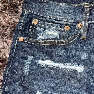 Men’s Aeropostale denim shorts size 30, in good used condition. Slim short. Distressed ( holes have backing behind it so it isn’t technically holes). Material is 79% cotton, 20% repreve polyester, and 1% elastane.