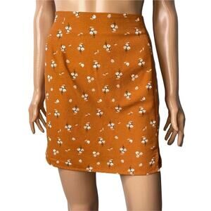 women’s mini skirt in a warm rust-orange color featuring a cute white floral print throughout. It has a straight, above-the-knee silhouette that fits smoothly at the waist and hips. The soft, stretchy knit fabric makes it comfortable and easy to wear, while the tiny floral clusters add a feminine, summery touch.