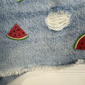 Aeropostale women’s vintage high rise shorty daisy & watermelon print denim shorts. Size 4. No stretch. Good Preloved condition