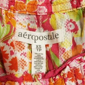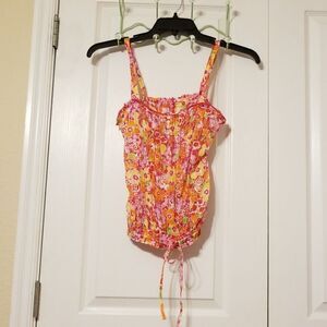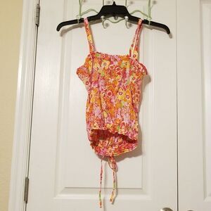 Multi colored floral printed blouse with ruffles on the bottom with a tie string on the bottom and with 4 buttons on the front and it has adjustable straps.