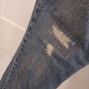 Faded distressed ripped whiskered broken in jeans.