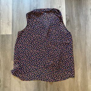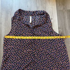 Keep it breezy yet feminine in this airy sleeveless button down hi-low top from Aeropostale. Allover tulip/floral print. Navy background with pink/orange/white flower print. Size XL. Please see photo section for approximate flat measurements. Note: semi sheer—especially in direct sunlight. For a more modest vibe pair it with a camisole underneath.