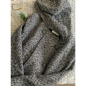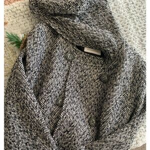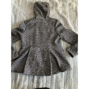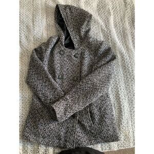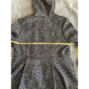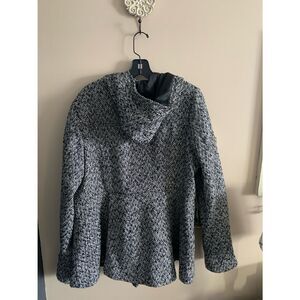 Lined on the inside. Hood on the back, great for dressing up or down. Has nice detailing and very flattering A Line type fit.