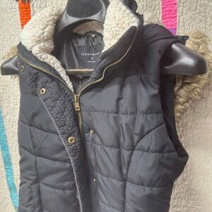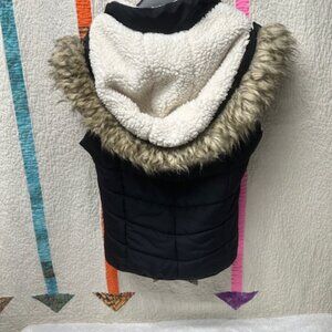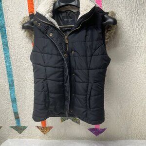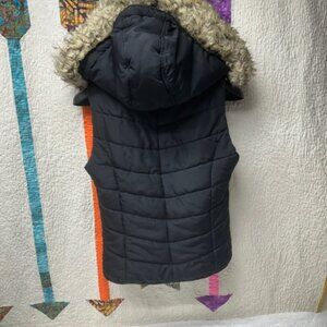 The Aeropostle Hooded Quilted Puffy Vest is a stylish and practical addition to any woman's wardrobe. Made from polyester, this black quilted vest features a hood for added warmth and versatility. With a size small and a regular fit, this vest is perfect for layering over dresses or tops for a chic and comfortable look. Perfect for everyday wear or for adding a sporty touch to an outfit, this Aéropostale vest is a must-have for any fashion-forward woman.