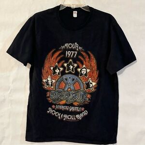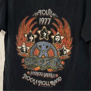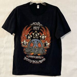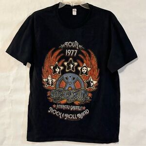 Vintage-style black t-shirt featuring Aerosmith 1977 tour graphic. Bold and iconic design. Used good condition steamed before shipping.
