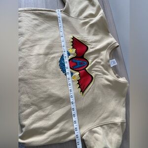 Embroidery is colorful and pops against neutral beige crewneck