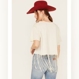 Cream colored rodeo style graphic horseshoe band tee with Aerosmith lyrics “ridin’ into town alone by the light of the moon, back in the saddle.” Has a fun fringe cut hem and a cropped boxy tee fit.