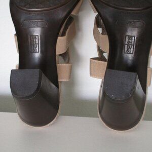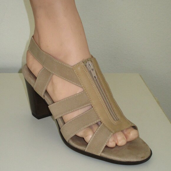 Aerosoles A2 Heelrest "Grand Canyon" Womens Tan Elastic Open Toe 3" Heel. Size 8.5M. Previously owned but barely used, uppers are clean and in excellent condition, while the soles & heels reveal only minimal wear.