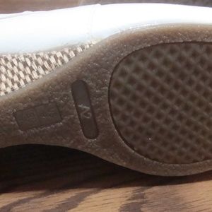 Without the box, shiny white leather open toed sandals featuring raffia wedge heels 2 1/2" high.