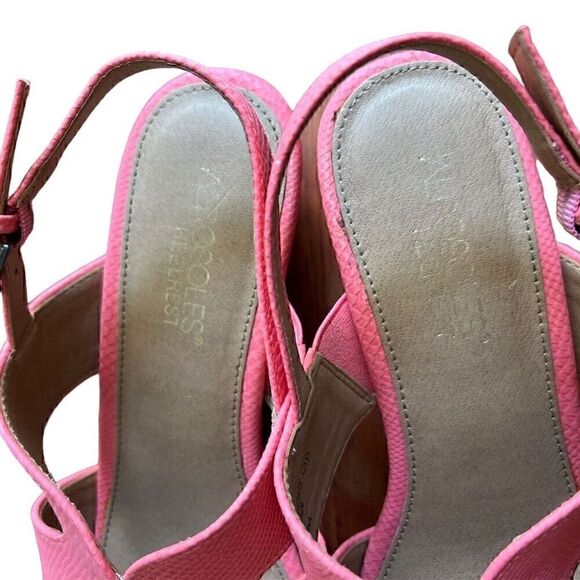 Aerosoles Appreciate wedge sandals in very good, pre-owned condition. Coral snake print with adjustable slingback strap and buckle closure. Open toe construction and cushioned footbed for comfort. Durable synthetic sole with diamond pattern. There is some wear at the front of the toes (see photo 6), but it is not highly noticeable.