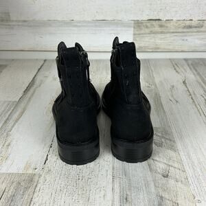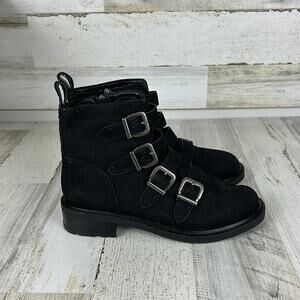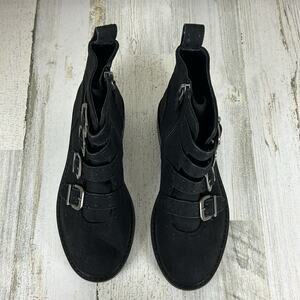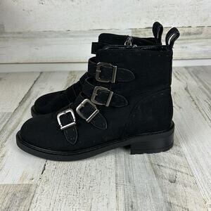 Aerosoles Arezzo womens sz 5 1/2 black faux leather zip up buckle ankle boot, boots are new they were are showroom sample. buckle up accent but has a side zip closure. faux suede, low block heel