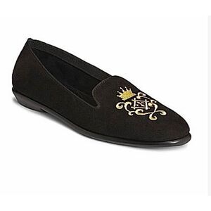 Aerosoles Betunia Women’s Black Suede Leather Slip on Loafers Gold Crest Toe Embroidery