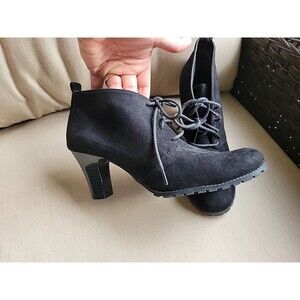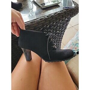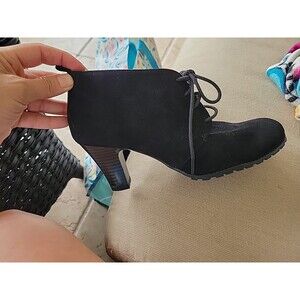 The Aerosoles Black Ankle Boot in size 6M is a stylish and versatile choice for women. With a solid black color, high heel height, and zipper accents, these boots are perfect for a fashion-forward look. Made with a suede-like fabric upper, they provide both comfort and durability. The ankle shaft style and medium shoe width make them both trendy and practical for everyday wear. The Aerosoles brand ensures quality and style in this fashionable ankle boot. Booties tie closure makes these versitile.