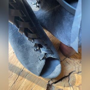 Open toe three inch covered heel soft suede booties with lace up detailing.