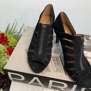 Very cute black bootie by Aerosoles heelrest. This bootie has peek -a-boo slits on both sides. I love front zipper detail and the open toe. One of the most comfortable shoes on the market. Women's size 9. Gently worn.
