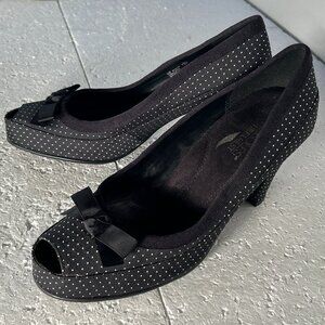 Aerosoles SZ 9 Benefit Black Polka Dot Peep Toe Heels 50's Bow Pin Up Office Comfort