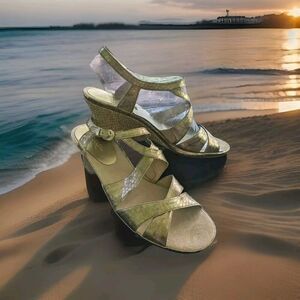 Elevate your evening look with these gorgeous Aerosoles Bakers Dozen sandals in a stunning gold color. The ankle and criss cross straps add a touch of elegance, while the wedge heel provides a comfortable fit for hours of wear. The sandals feature a buckle closure and adjustable straps for a secure fit.