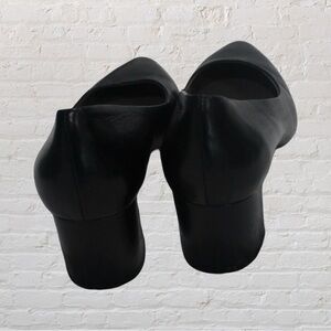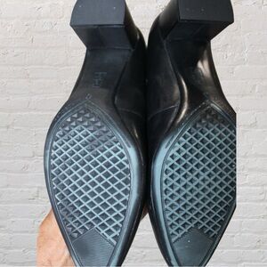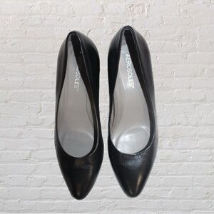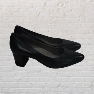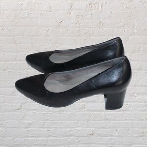 Black leather pumps by Aerosole. 2" block heel. Rubbersole.