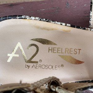 Aerosoles A2 Heelrest Snakeskin Slingbacks Size 8, Medium width. Faux leather upper in snake skin pattern. Almond toe and 2 inch block heel create smart silhouette for sophisticated work-to-weekend style. Adjustable strap with buckle in silver. Aerosoles describes its A2 Heelrest design as a comfort technology that distributes your body weight toward your heel to deliver superior comfort. Manmade lining and outsole.