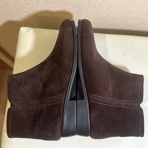Preowned. very lightly worn. Noticed leather wear inside of both booties as pictured. Inside zipper 1 inch heel. Notice these booties are as pictured. The only wear is on the inside of both shoes.