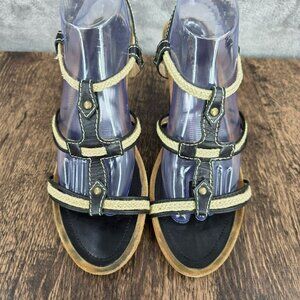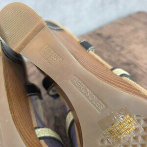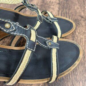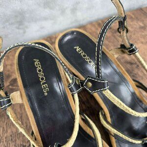 Aerosoles Swish Bone Strappy Wedge Sandals 11 Black Leather Natural Jute Comfort