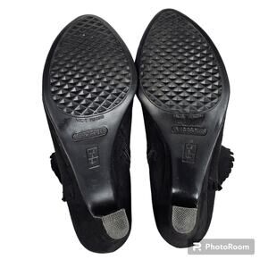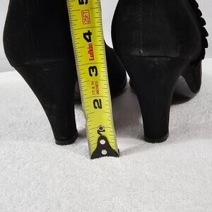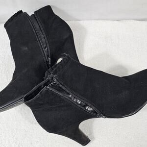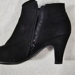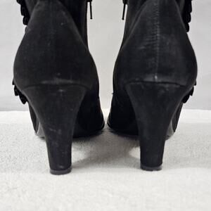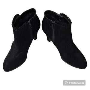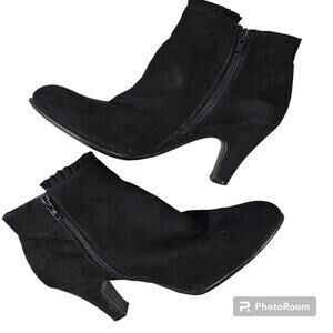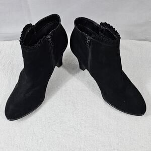 This is a pair of black booties by Aerosoles in the style called Tape Gun. They feel like suede, but printed with "fabric upper." They are in EUC. They have zippers on the interior side of the boot and the outside is decorated with cute little ruffles. Women's size 9.