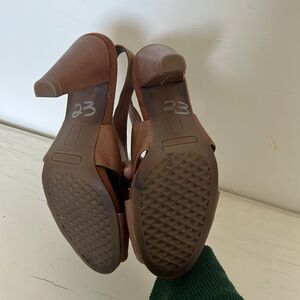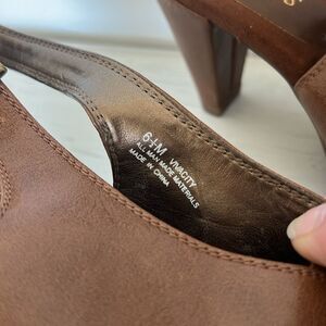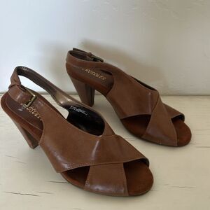 Aerosoles heels, slingback sandals, heeled sandals, brown faux leather, dress shoes, comfortable heels, classic sandals, workwear shoes, size 6.5 shoes, heeled sandal
