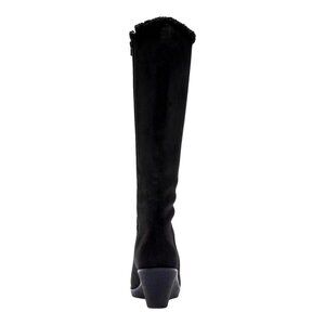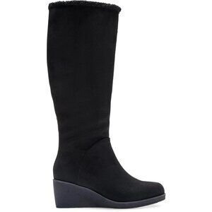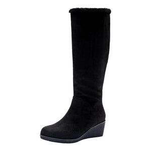 The Aerosoles Binocular Boots in Black Faux Suede are designed for all-day comfort and style. Featuring a round toe, 2.25" wedge heel, 0.5" platform, and 15.5" high shaft, these boots include a dual inside zipper closure, faux shearling lining, and memory foam footbed. The Diamond Flex synthetic sole ensures durability, making them ideal for casual wear, everyday use, or cold-weather outings.