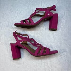 The product is a pair of Aerosoles women's heels in size 7. These pink strappy heels feature a block heel design and are made of suede material. With a stylish and comfortable design, these heels are perfect for adding a pop of color and elegance to any outfit. The Aerosoles brand ensures quality and style for the woman looking for a chic footwear option. Heel size 3.25" tall