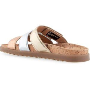 Aerosoles slides, metallic sandals, rose gold shoes, leather footwear, flat comfort sandal, women’s shoes, casual chic, slip-on, cork footbed, Aerosoles Lee, champagne sandal, new in box, comfort style, neutral metallics, travel sandal, summer slides, resort wear, size 8M, genuine leather, Aerosoles comfort.