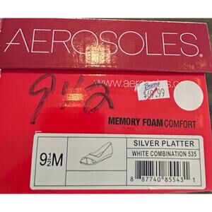 Aerosoles Women's Silver Platter Flat Lemon's Memory Foam Padded Womens Size 9.5. In used condition. Shoes come with original box. Flat, double padded memory foam insole, sueded sock insole, diamond pattern sole. Infuse a blend of laid-back vibe and buttoned-up style into your wardrobe. Slip-on open-toe loafer has a simple crisscross design across the toe that adds a finishing touch you'll love. Petite 1" heel, memory foam footbed and diamond patterned sole keep you on the move.