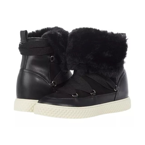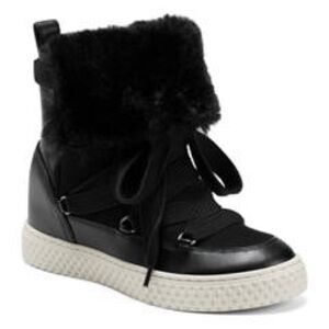 Aerosoles Zoya Lace Winter Boots Black Combo Faux Fur Women’s Size 8 Stylish black high-top sneaker boots with faux fur lining. Features lace-up design and white soles. Perfect for a trendy look.
